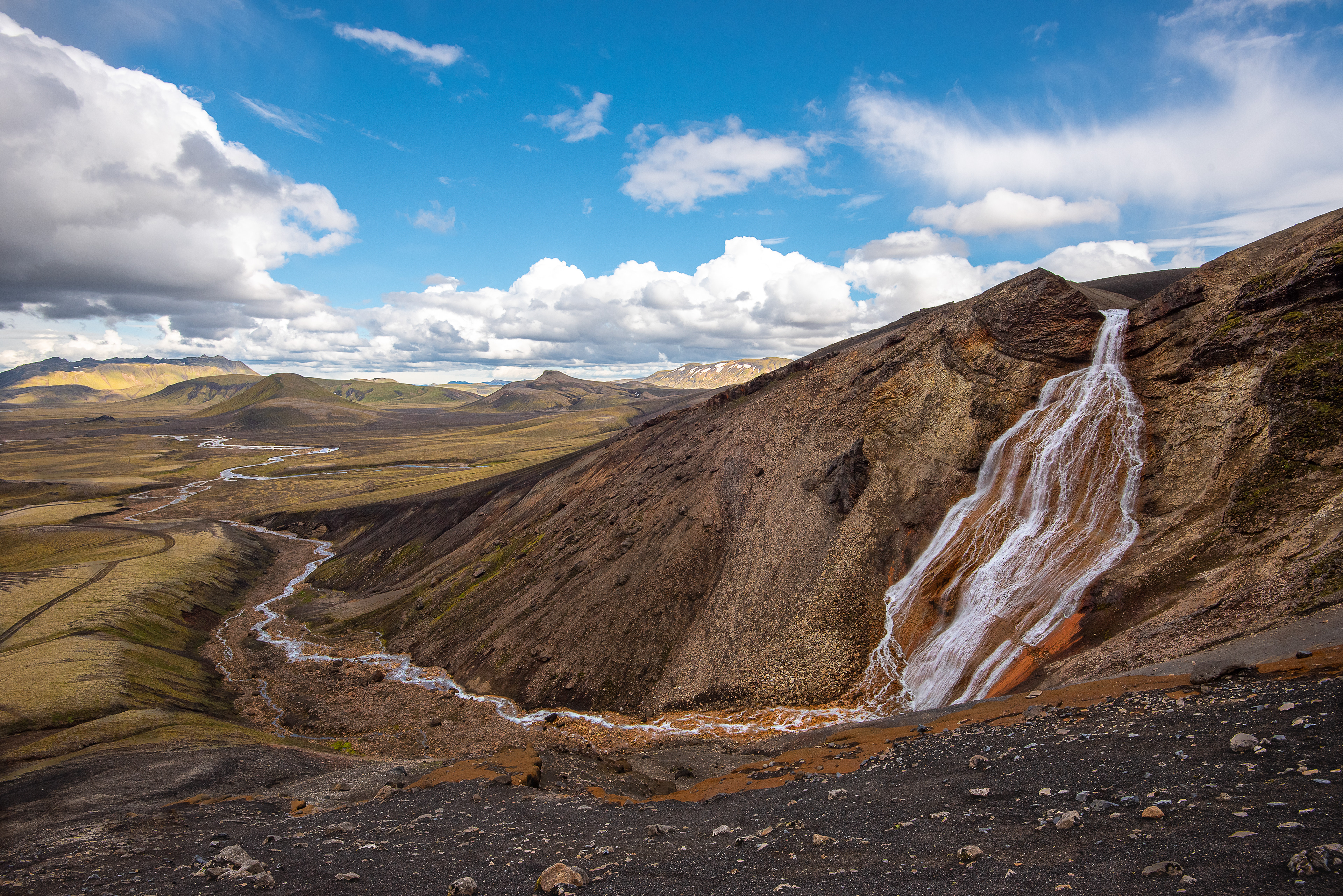 Rauðufossar waterfall is an extraordinary waterfall in a small spring-fed river in the Highland. The river bed of Rauðufossakvísl to the source is loaded with iron which makes the color red. The river and the source are all fantastic natural wonders and exciting places to visit for photographers.