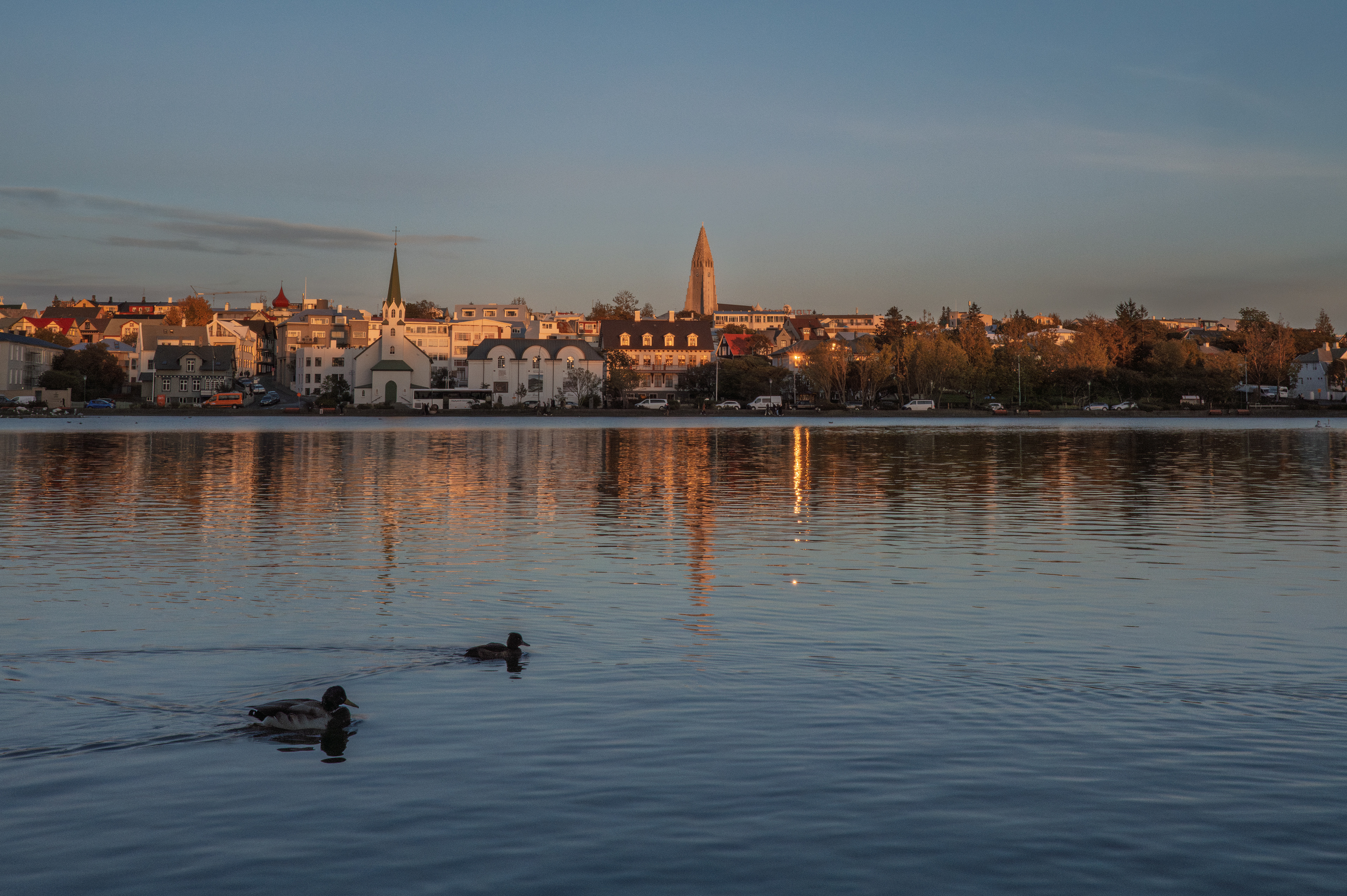 A view from the pond to Harpa towards Lækjargata