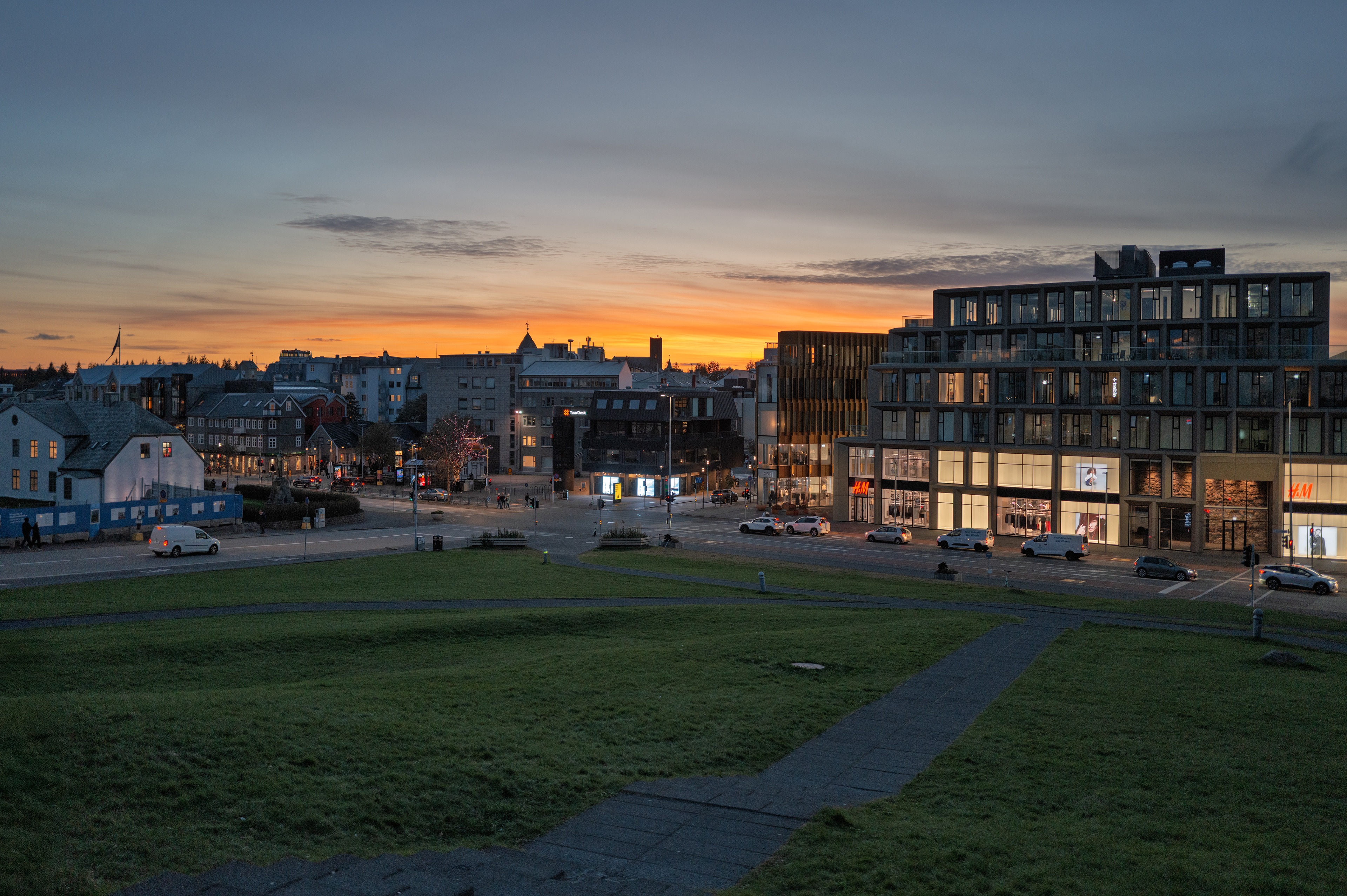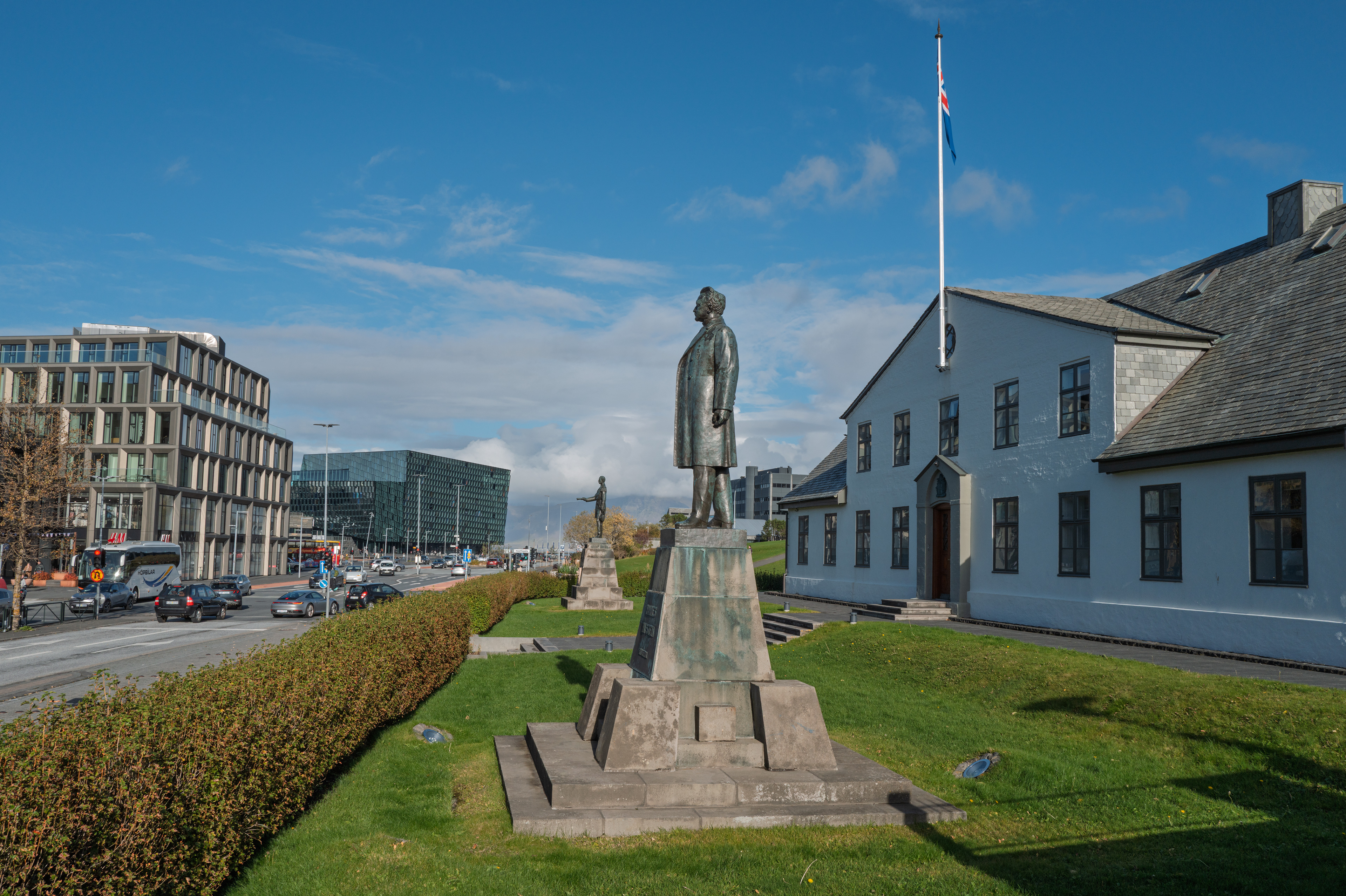 Hafnartorg rising at the harbor, with Lækjargata running straight to Harpa’s glass sails.