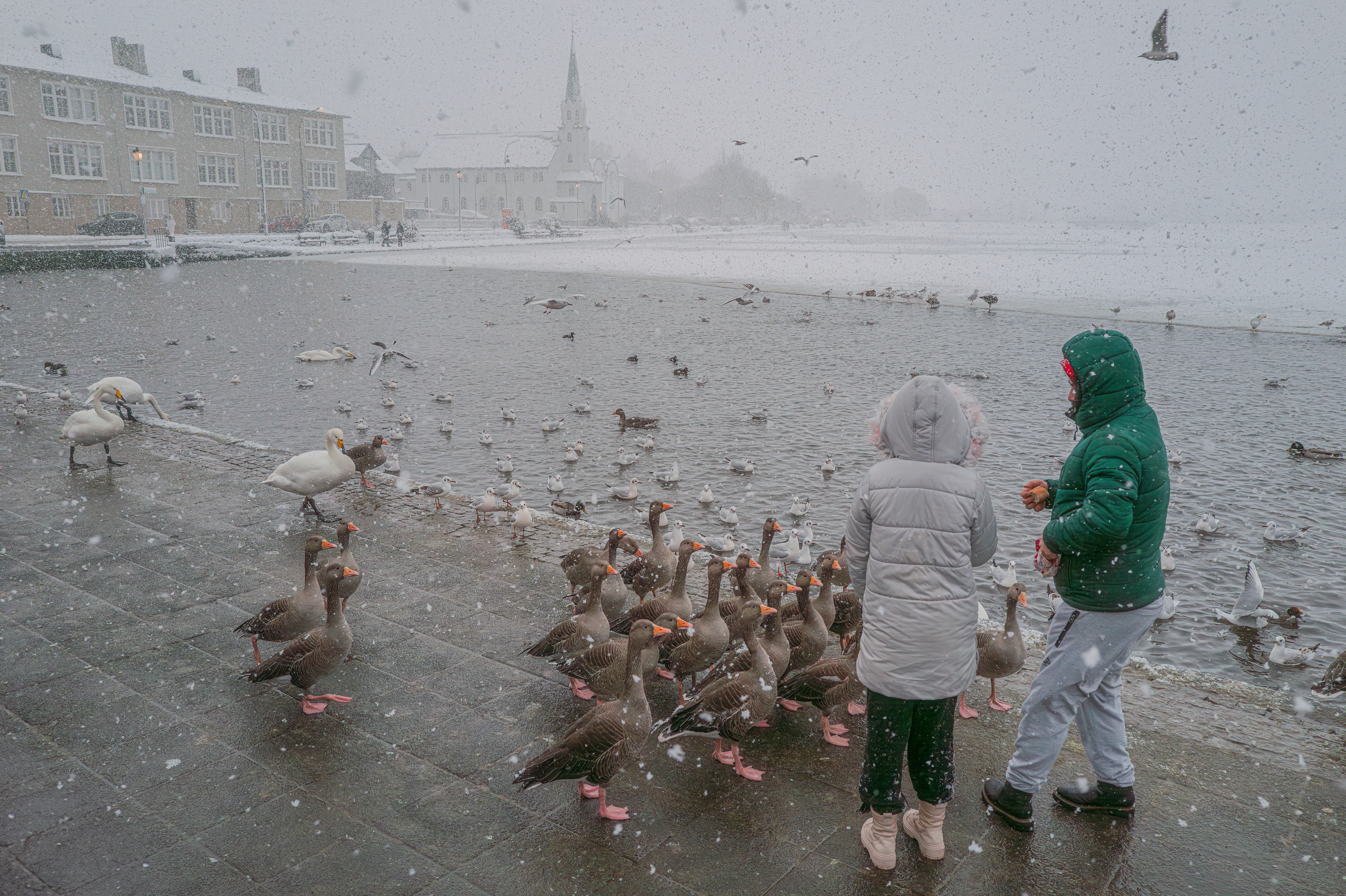 Tjarnargata in winter and the City Hall of Reykjavík by the pond, Tjörnin